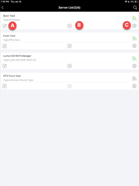 Device list – All available devices for viewing. This includes NVRs and standalone IP cameras.