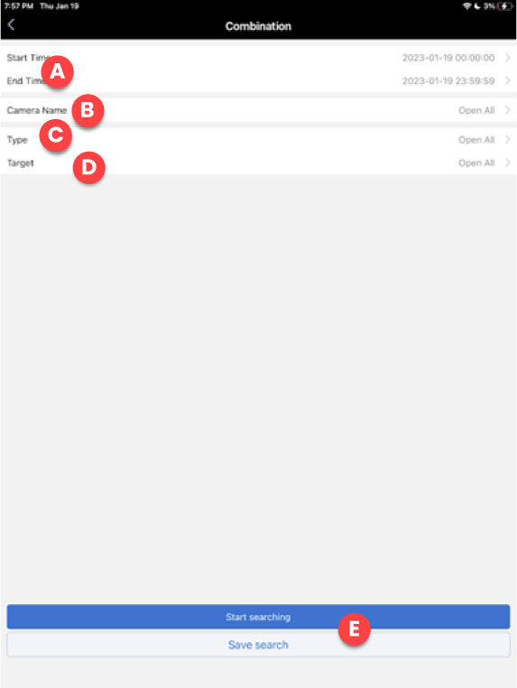Start/Save search – Begin searching archived footage based on the above parameters or save these search parameters for later.